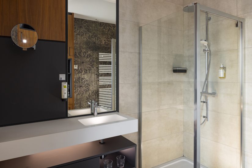 - Shower with seat + adequate space to move