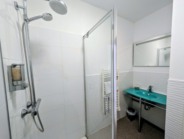 - Shower with seat + adequate space to move